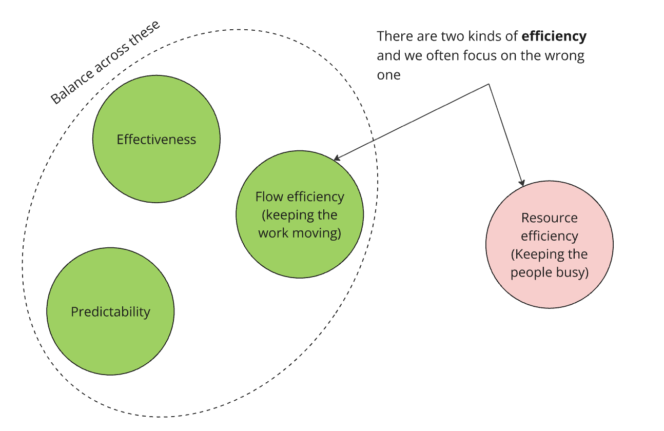 - Resource efficiency (busyness) is about ensuring that the people don’t run out of work; that they are always busy.